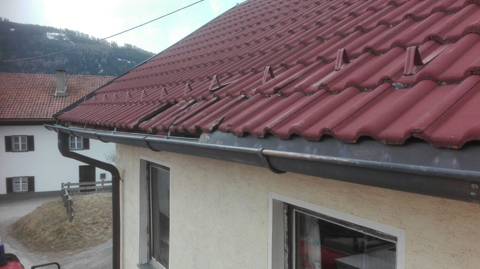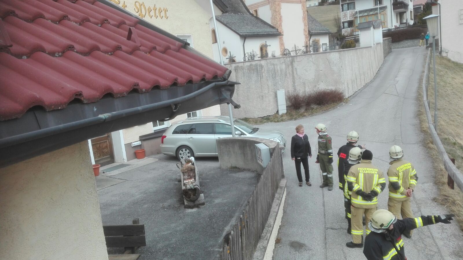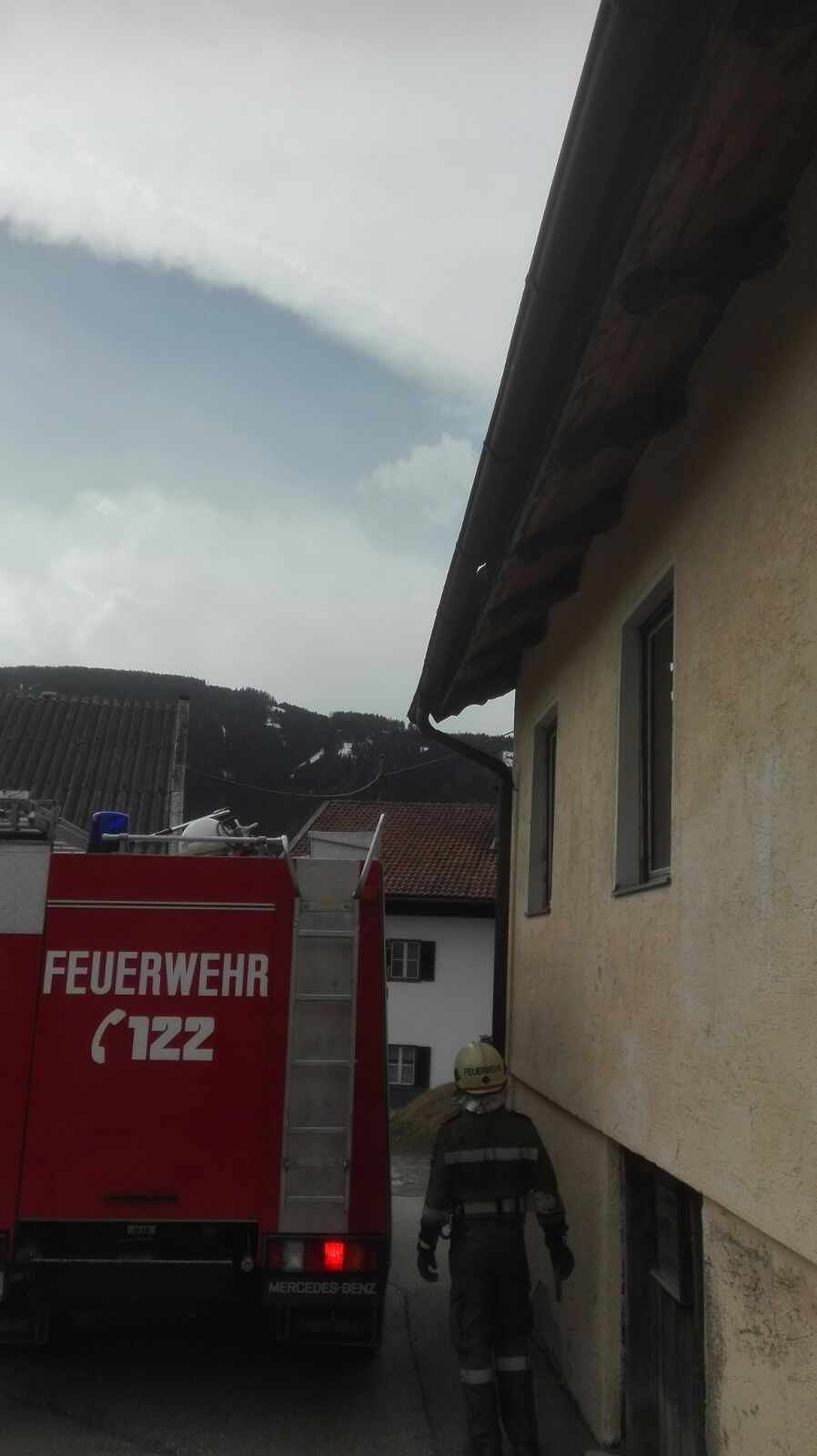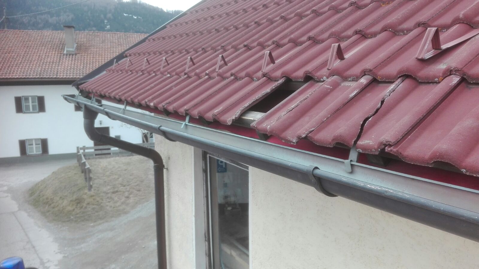 löste sich gegen 12:00 Uhr ein Abschlussblech vom Dachstuhl beim Pub.