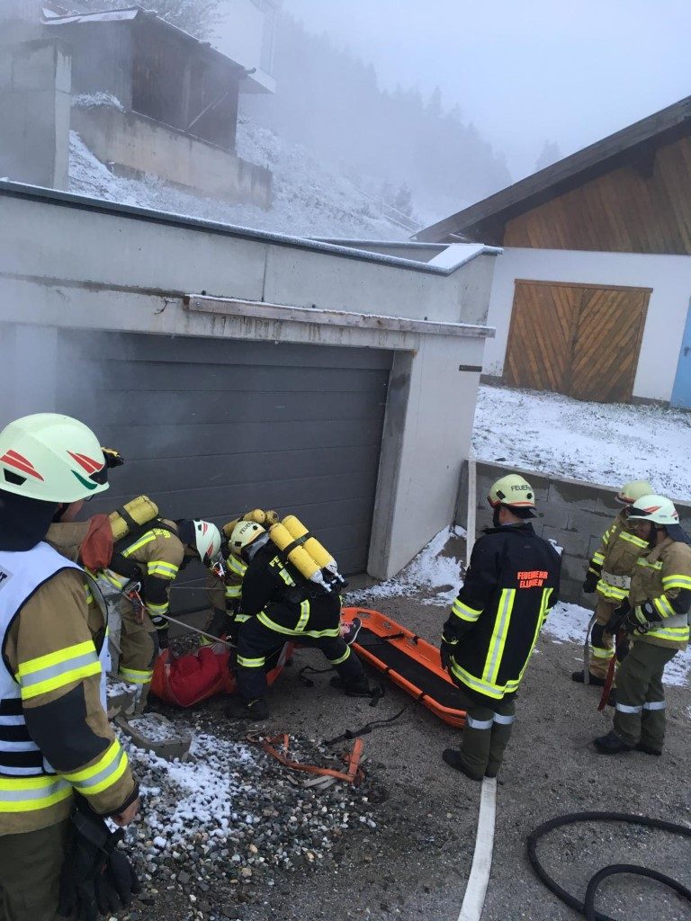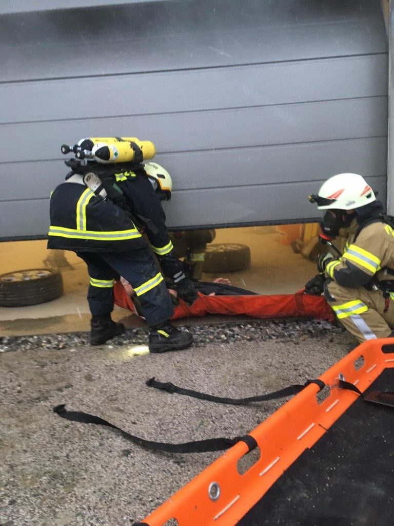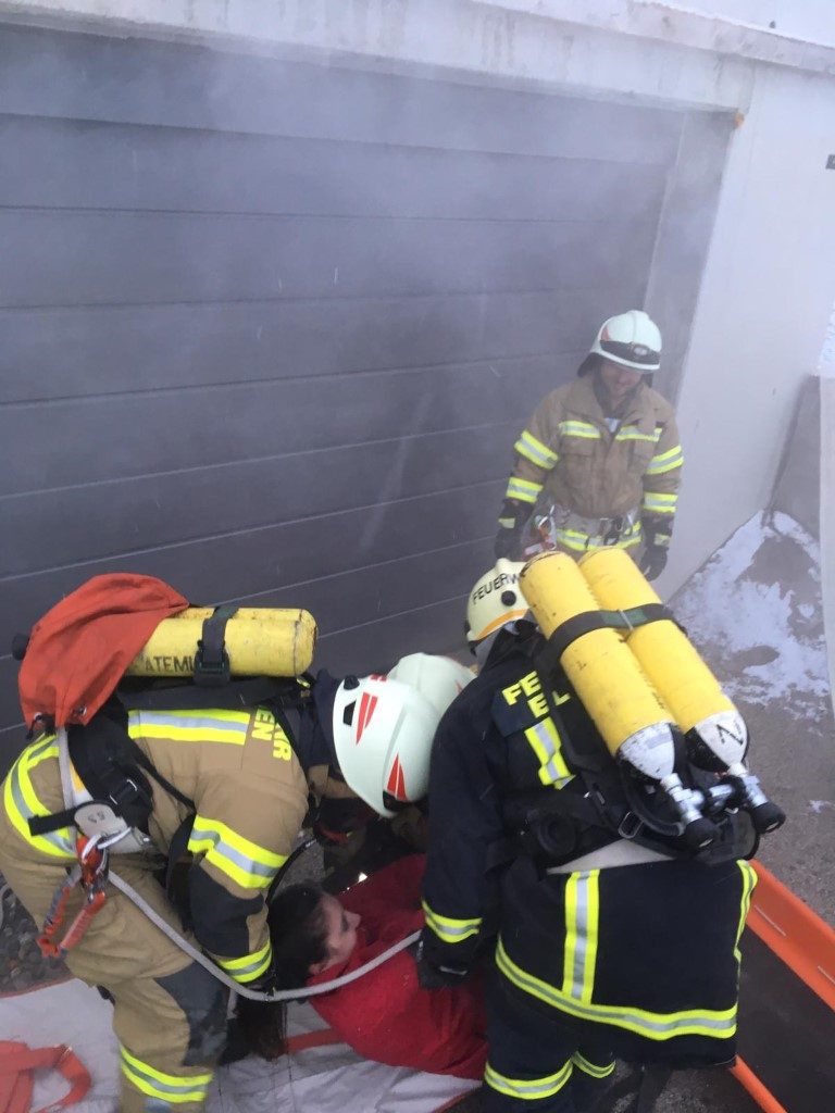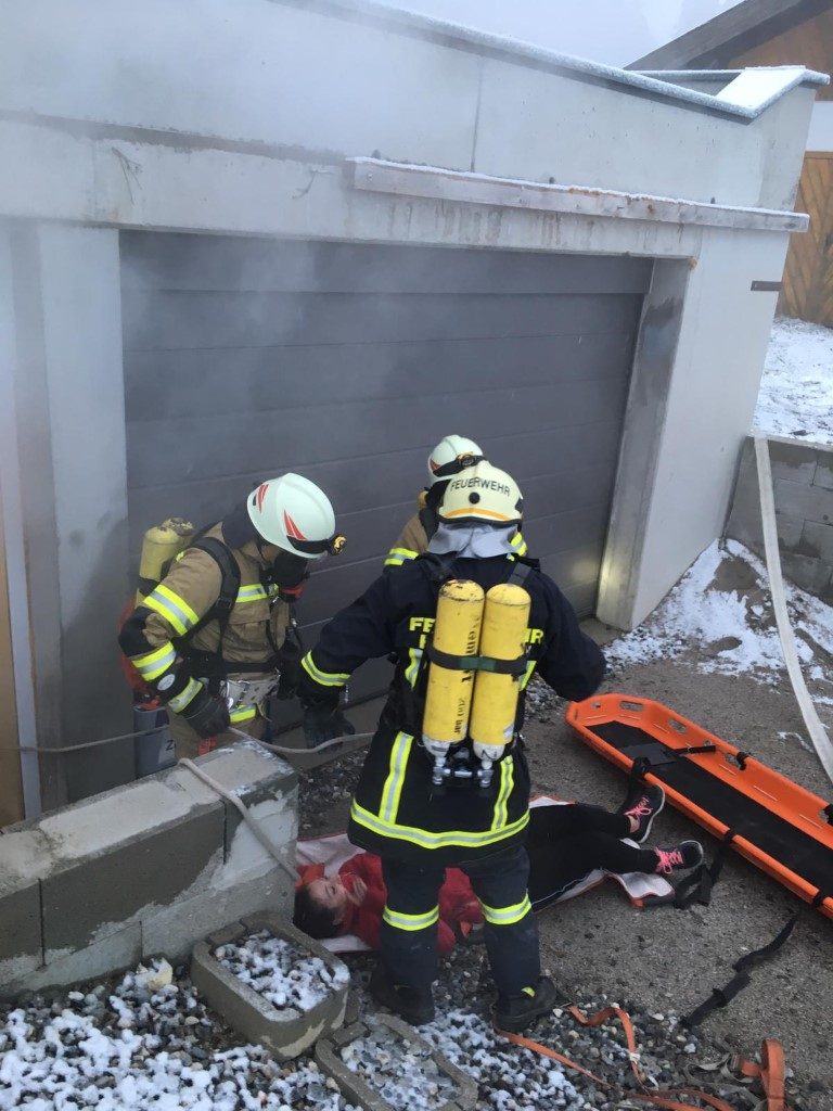 Übungsannahme war ein Garagenbrand mit 2 vermissten Personen, wobei 1 Personen zw. einem PKW und Wand eingeklemmt war.