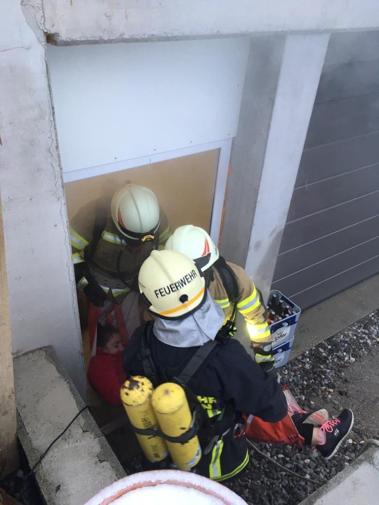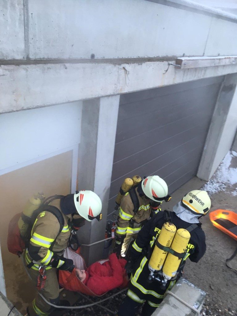 Ein Bewohner des Einfamilienhauses musste mit der Schiebeleiter vom Balkon geborgen werden. Parallel begann der Atemschutztrupp mit der Suche und anschließenden Bergung der 2 vermissten Personen in der Garage.
