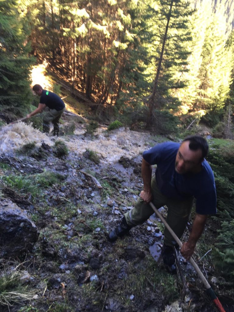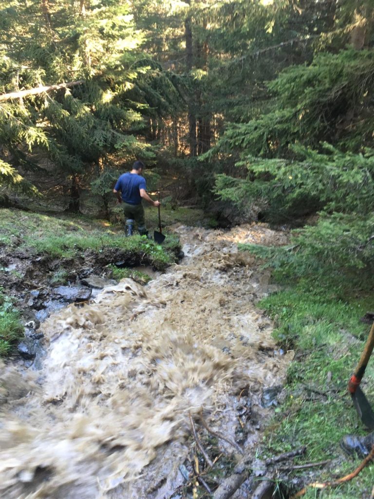 Mittels Pickel und Schaufel wurde der Bach wieder in das ursprüngliche Becken geleitet.