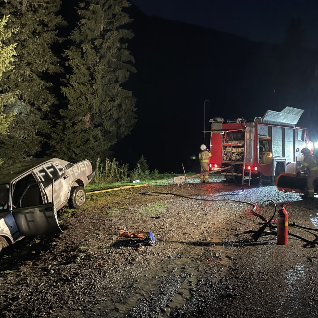 Am Dienstag den 12.09. fand die 3. Zug A Probe 2023 statt. Übungsannahme war ein drohender Fahrzeugabsturz mit eingeschlossener Person sowie eine weitere Person die als vermisst gemeldet wurde. Um 19:30 wurde die Mannschaft mittels Funk zum Einsatzort im Viggartal, Mesl, alarmiert. Sofort nach dem Eintreffen am Einsatzort wurde die eingeschlossene Person betreut und das Fahrzeug mittels Hubzug gesichert. Nach bekanntgabe der eingeschlossenen Person, dass es eine weitere vermisste, womöglich verletzte, Person gibt, wurde umgehend die Suche nach dieser gestartet. Die eingeklemmte Person konnte rasch gefunden, mittels Treibwinde befreit und anschließend geborgen werden.