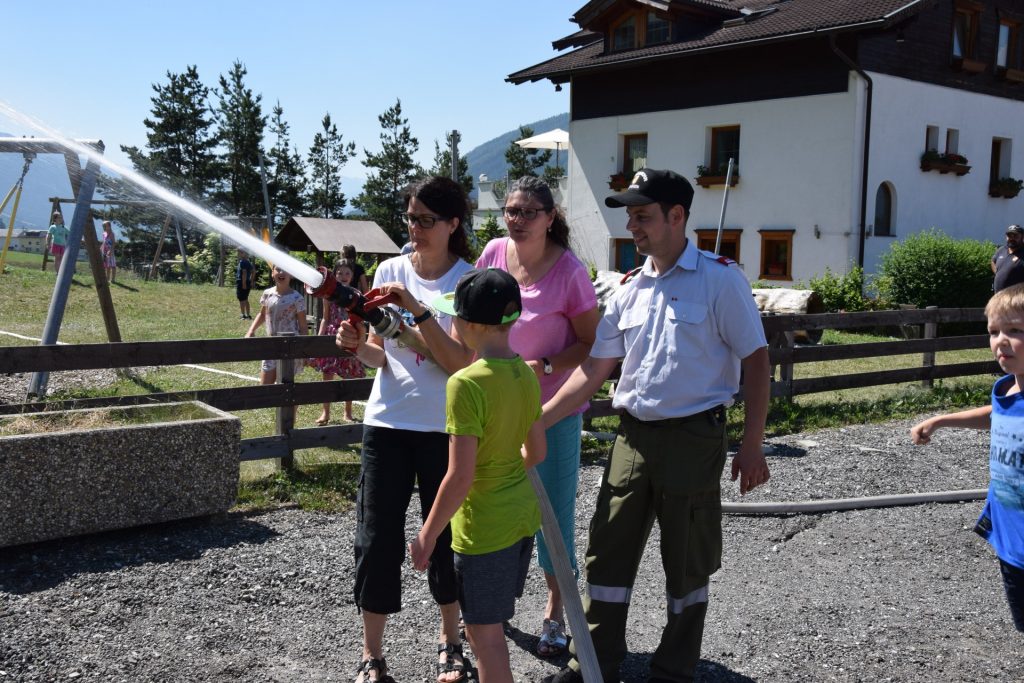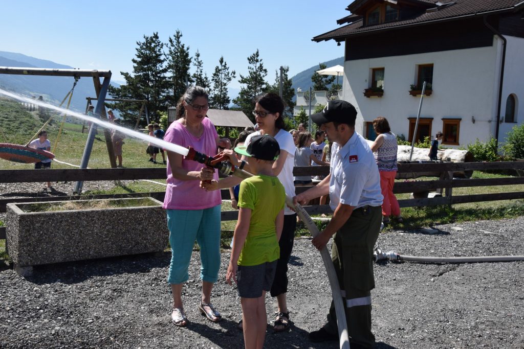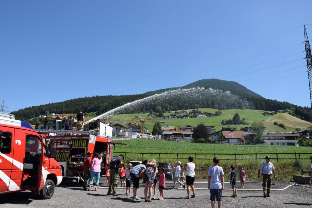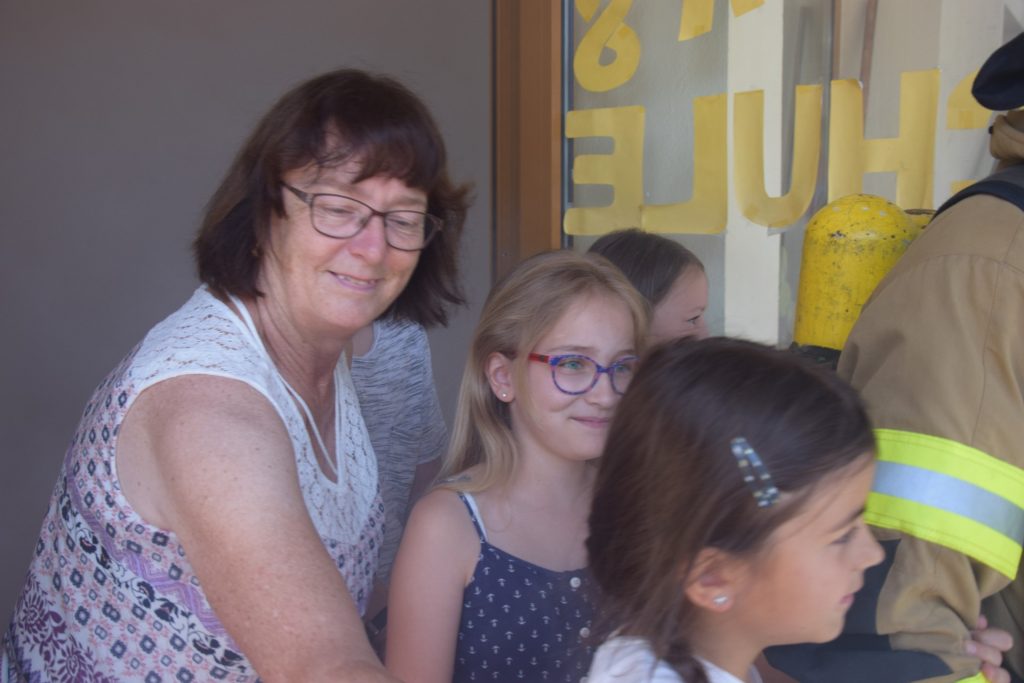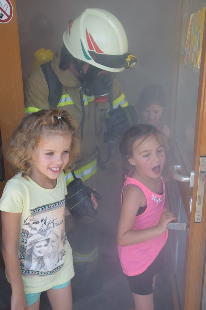 Reinhard Ribis erklärte den Kindern zuerst die wichtigsten Dinge über die Feuerwehr und das richtige Verhalten in einem Ernstfall. Dazu wurde anschließend eine kleine Übung mit den Schülern durchgeführt. Die Kinder konnten die Fahrzeuge bestaunen und natürlich wurden erste „Löschversuche“ mit dem Strahlrohr und sogar mit dem großen Wasserwerfer ausführen.